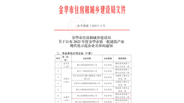 在近日公布的“金華市第一批建筑產(chǎn)業(yè)現(xiàn)代化示范企業(yè)”名單中,浙江經(jīng)典建設(shè)有限公司赫然在列。這是金華市為進(jìn)一步激發(fā)和調(diào)動全市...
